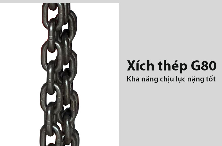• Xích tải: được làm từ hợp kim thém G80, có khả năng chịu lực tốt, phù hợp nâng hạ với các loại tải trọng lớn.
