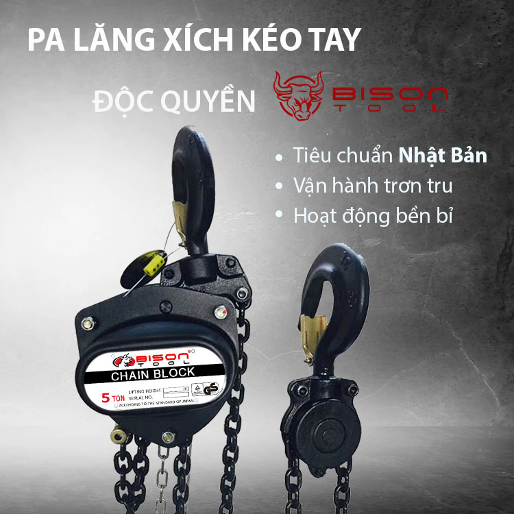 Pa lăng xích kéo tay BISON 5 Tấn với quy trình sản xuất và kiểm tra chất lượng khắt khe, sản phẩm đạt chất lượng tương đương với các sản phẩm thương hiệu Nhật Bản, nhưng có mức giá tốt hơn, giúp khách hàng tiết kiệm chi phí mà vẫn đảm bảo sản phẩm chất lượng cao. Pa lăng thương hiệu Bison có ưu điểm dễ sử dụng, lực kéo nhẹ, dễ vận chuyển, ít hư hỏng. Được sử dụng rộng rãi do tính cơ động cao, gọn nhẹ, phù hợp cho mọi điều kiện làm việc và đặc biệt thích hợp cho những nơi không có nguồn điện.