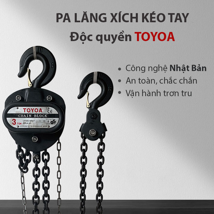 Pa lăng xích kéo tay TOYOA là sản phẩm thuộc thương hiệu độc quyền của công ty TNHH Vật tư công nghiệp Trung Hưng. Pa lăng xích kéo tay Toyoa được sản xuất trên dây chuyền công nghệ hiện đại theo tiêu chuẩn Nhật Bản, đạt các tiêu chuẩn chứng nhận CE, GS nên bạn hoàn toàn có thể yên tâm về chất lượng sản phẩm.