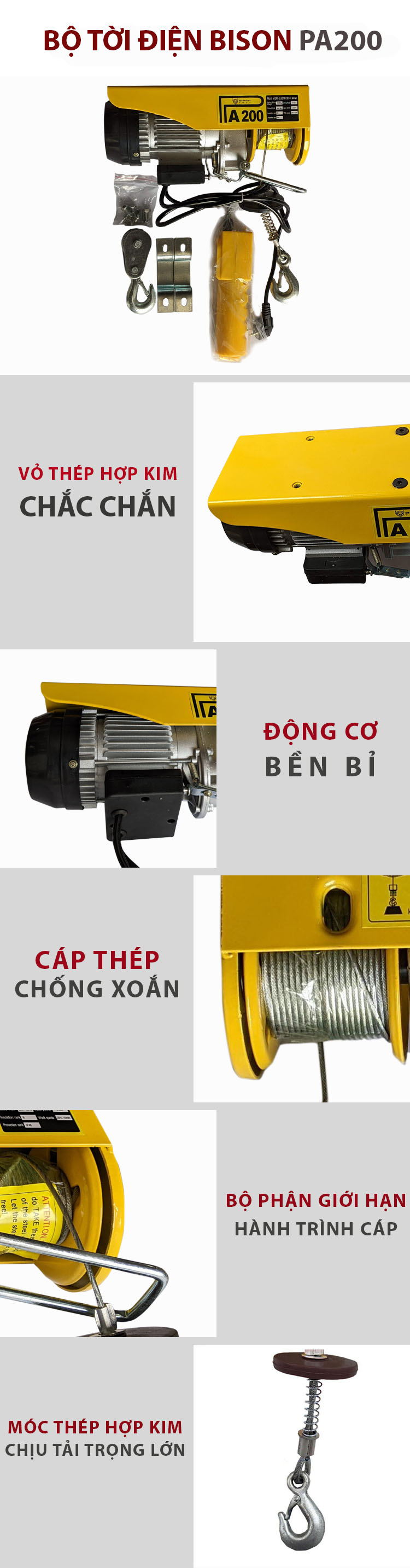Tời điện Bison PA200 12m được sản xuất theo công nghệ châu Âu, có độ bền cao đem lại sự an toàn cho con người trong quá trình sử dụng. Mang thiết kế tương đối nhỏ gọn, trọng lượng nhẹ nên có thể dễ dàng di chuyển thiết bị đến những công trình làm việc khác nhau